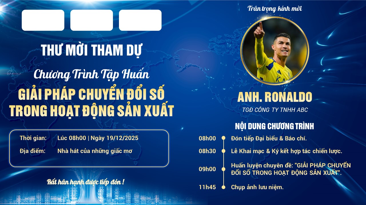 - Option 1 (Có hình Khách mời/Diễn giả): Dành cho các buổi tập huấn, hội nghị có diễn giả nổi tiếng (Keynote Speaker) hoặc vinh danh lãnh đạo. Hình ảnh chân dung đại biểu (như ví dụ trong hình là cầu thủ Ronaldo) được lồng vào khung tròn mạ vàng sang trọng.